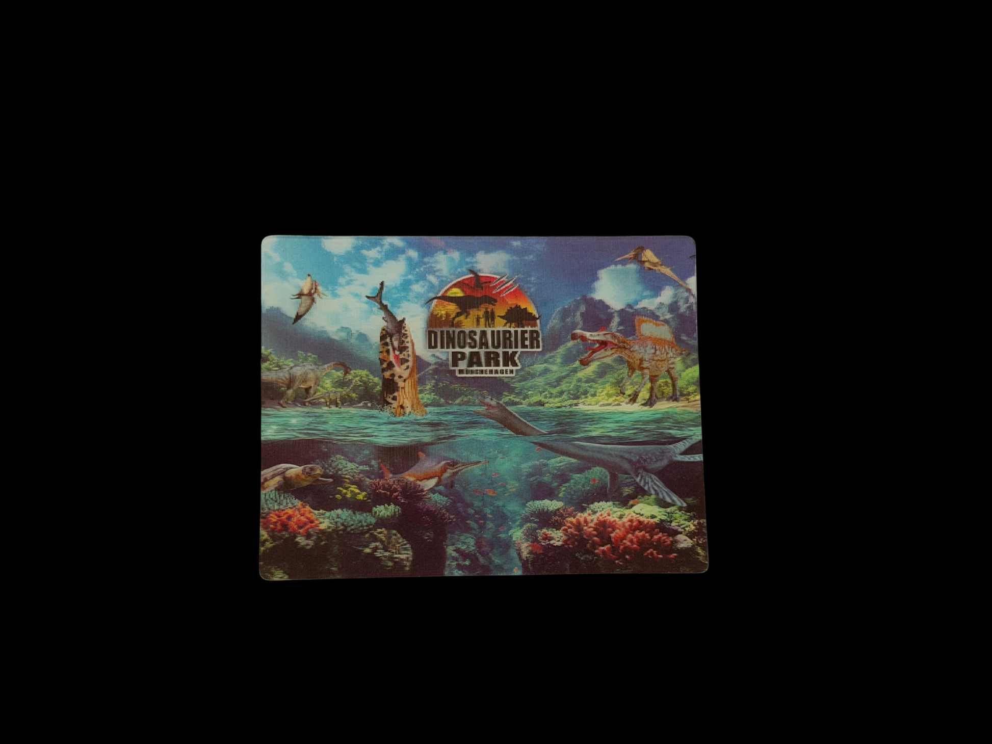 Auffälliger 3D-Magnet mit Dinosauriern/ Wasser- und Uferlandschaft und Dinopark Münchehagen Logo in Blautönen. Ein tolles Souvenir!
