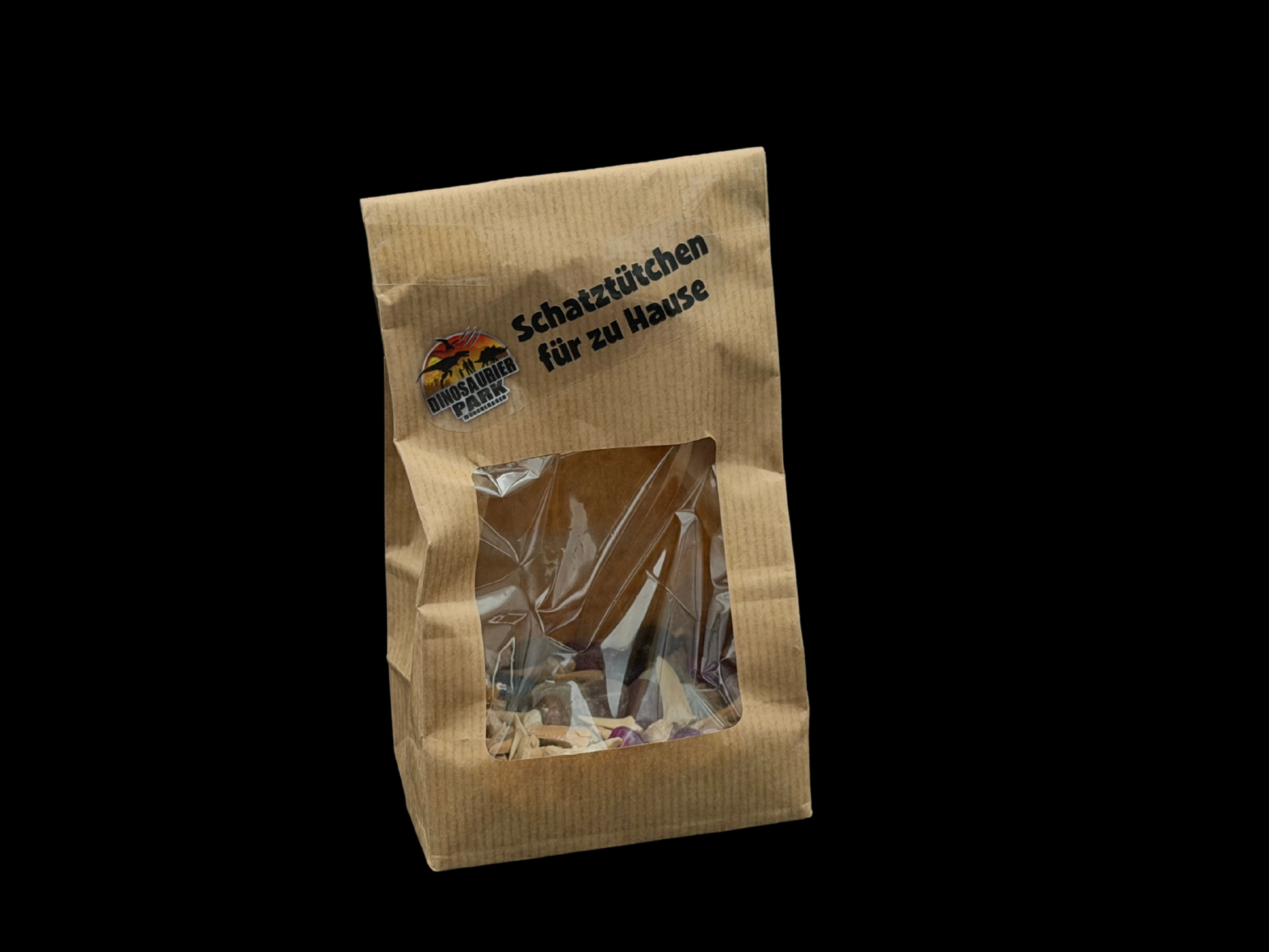 Ein Highlight für kleine Abenteurer! Das Schatztütchen enthält auf Sand gebettete halbfossile Haifischzähne und bunte Trommelsteine zum Ausbuddeln, Entdecken und Basteln – echtes Dinoabenteuer für Zuhause.